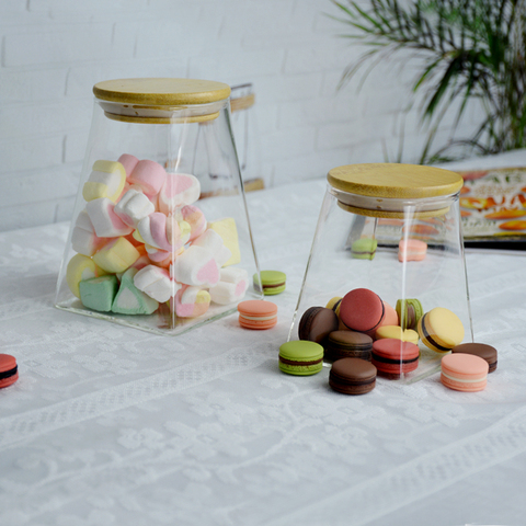 طاولة شفافة مع غطاء خيزران ، برطمانات طعام محكمة الغلق للمطبخ المنزلي ، تخزين مزخرف للمارشملو ماكارون
